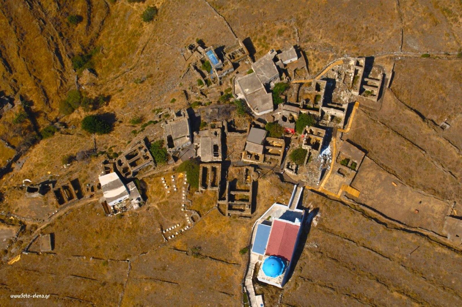 As you may imagine, in the past the village was a pass from Kato Meri to Chora via cobbled roads. Picturesque, of quite few inhabitants, perennial oaks, stone arched bridges, pigeon houses of 1927 and watermills across the homonymous ravine. In the highlights, the oil mill, an interesting building and at the same time a “monument” of the interesting agricultural history of the island.